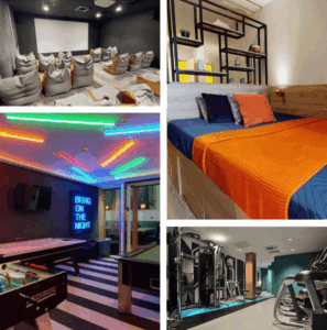 - 施設には、社交スペース、勉強スペース、スクリーンルーム、ゲームルーム、ラウンジエリア、ジム、フィットネススタジオ、洗濯室、ダイニングルームとキッチン、自転車用の駐車場、1階の屋外コートヤードエリアがございます。